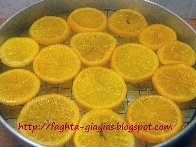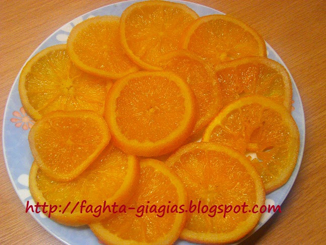 | Όταν παγώσουν τελείως, τα βγάζουμε και τα αφήνουμε πάνω σε σχάρα, ή σε μια λαμαρίνα στρωμένη με αντικολλητικό χαρτί (λαδόκολλα), για να στραγγίσουν, για 5' - 10'. Τα ψήνουμε σε προθερμασμένο φούρνο, στους 165°C στη μεσαία σχάρα, σε αέρα για 30'- 40', περίπου (ανάλογα το πάχος των πορτοκαλιών), μέχρι να στεγνώσουν καλά. Τα χρησιμοποιούμε όπως είναι, ή τα βουτάμε σε σοκολάτα και τα κάνουμε σοκολατάκια. -- Προσέχουμε να μην μας βγουν πολύ λεπτές οι φέτες, γιατί θα μας διαλυθούν. Αν θέλουμε να κόψουμε τα πορτοκάλια σε ισόπαχες φέτες, χρησιμοποιούμε το μαντολίνο. http://faghta-giagias.blogspot.com | |