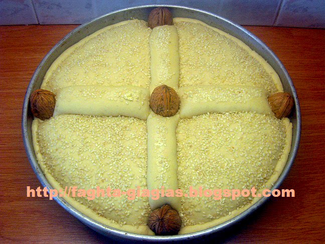 | Με λίγο ζυμάρι που έχουμε κρατήσει, φτιάχνουμε δύο κορδόνια, τα οποία τοποθετούμε πάνω στο ψωμί, σε σχήμα Σταυρού και ό,τι άλλο σχέδιο θέλουμε. Στολίζουμε με καρύδια ή αμύγδαλα και πασπαλίζουμε με το σουσάμι. | |