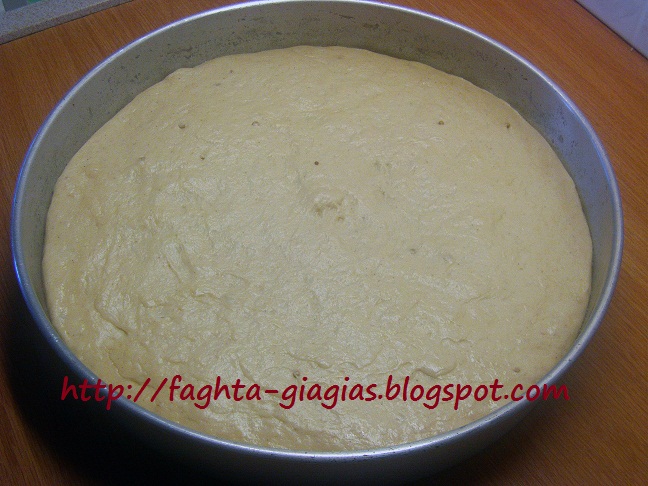 | Όταν η ζύμη φτάσει στο χείλος του ταψιού, με μία οδοντογλυφίδα τρυπάμε στις τέσσερις άκρες στην επιφάνεια, με προσοχή, για να μην μας ξεφουσκώσει. Ψήνουμε σε προθερμασμένο φούρνο, στους 200°C στις αντιστάσεις, για 1 ώρα περίπου, μέχρι να ροδίσει καλά. | |
