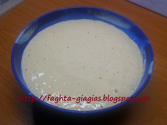 | Σ᾿ ένα μπολ ρίχνουμε το 1 φλυτζάνι νερό χλιαρό, 1 κουταλάκι του γλυκού ζάχαρη, από τη ζυγισμένη και τη μαγιά. Ανακατεύουμε μέχρι να διαλυθούν και προσθέτουμε αλεύρι, από το ζυγισμένο, περίπου 10 κουταλιές της σούπας, μέχρι να γίνει ένας χυλός. | |