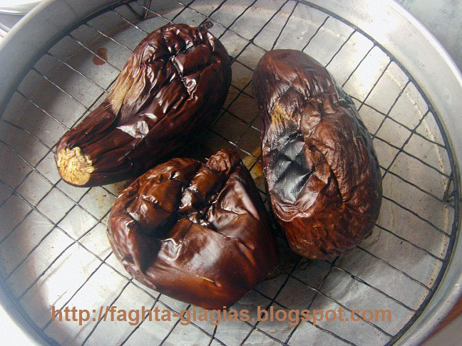 | Τις τοποθετούμε σε σχάρα και τις ψήνουμε στο γκριλ, σε χαμηλή θερμοκρασία. Δεν πρέπει να τις βιάσουμε στο ψήσιμο, γιατί οι μελιτζάνες πρέπει να σιγοψηθούν και να απορροφήσουν από μόνες τους, όλα τα υγρά τους. Αυτό μπορεί να χρειαστεί 1 ώρα περίπου. | |